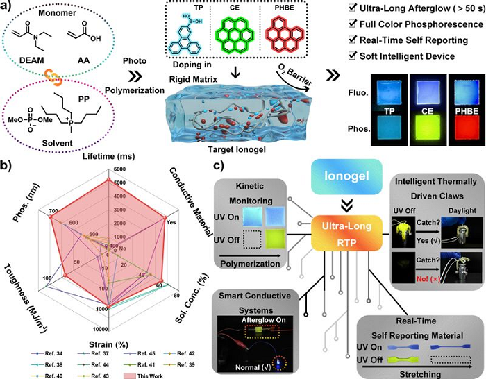 图片说明:a) 超长室温磷光离子凝胶的光聚合制备过程及性能示意图;b) 文章所报道的超长室温磷光离子凝胶材料与领域内同期报道材料的性能对比雷达图;c) 超长室温磷光离子凝胶材料用于智能监测应用的示意图。