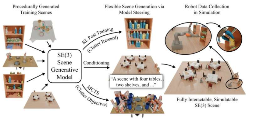 麻省理工学院计算机科学与人工智能实验室(CSAIL)与丰田研究院的研究人员开发出“可控场景生成”方法,可创建厨房、客厅等数字场景,用于模拟大量现实世界互动。该方法在超过4400万个3D房间中训练,内含桌子、盘子等物体模型,通过“引导”扩散模型生成物理上精确、逼真的环境。其核心策略是“蒙特卡洛树搜索”(MCTS),模型创建备选场景,以不同方式填充,实现特定目标,如增强物理真实感或包含更多可食用物品。