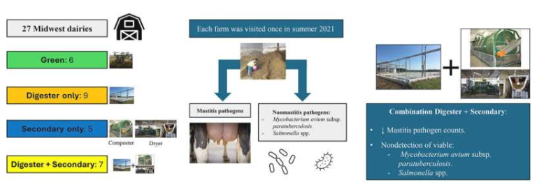 研究显示,与原料固体相比,单一处理工艺可降低乳腺炎病原体和非乳腺炎病原体的细菌水平,但最终产品中仍能检测到部分病原体。采用厌氧消化结合堆肥或干燥等二次处理的农场表现最佳,其回收粪便固体垫料中乳腺炎病原体数量显著降低,且未检出沙门氏菌和鸟分枝杆菌。Peña-Mosca指出:"消化系统与二次处理相结合比单一方法更能有效控制病原体风险,这有助于降低奶牛场疾病传播概率。"