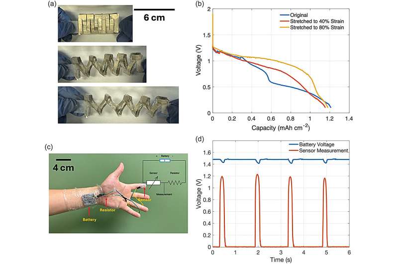 为使该可拉伸电池具备形变能力,研究人员将酸悬浮于明胶中,并采用剪纸工艺进行结构设计。测试表明,电池可拉伸至原尺寸的80%而不影响性能。在实际应用中,该电池为手指触控传感器供电时,输出电压略低于AA电池。