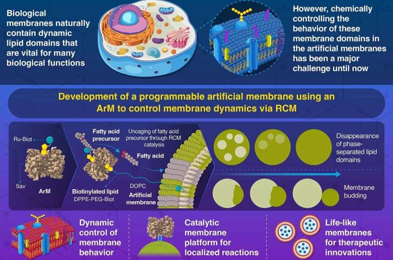 研究团队设计了一种由蛋白质链霉亲和素与合成金属催化剂构成的人工金属酶。该酶被固定在脂质膜表面,能够催化闭环复分解反应,释放出的游离脂肪酸可改变膜的结构特性。领导该研究的金原和志教授表示:“这有点像赋予合成膜呼吸和反应的能力。通过控制膜表面的化学反应,我们可以让它像活细胞一样进行自我重组。” 这种催化调控策略首次实现了通过化学方法对人工膜动态物理行为进行编程。