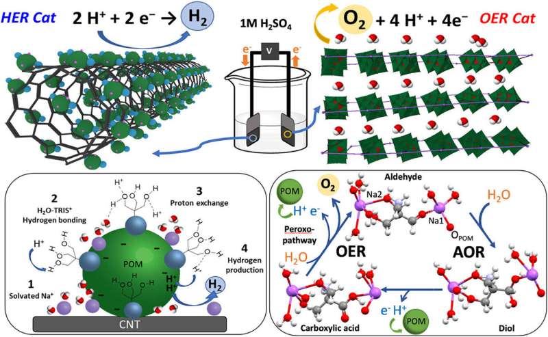 这种分子开关催化剂的核心是一种由钒簇与有机阳离子组成的混合材料。研究负责人María Giménez-López解释道:“关键不在于金属簇本身,而在于其周围有机阳离子的排列方式。”当该材料与碳纳米管物理混合时,阳离子被锁定在结构内部,材料倾向于催化生成氧气。而当它以特定方式组装时,阳离子被释放到表面,起到捕获质子的作用,从而使同一材料变为高效的制氢催化剂。