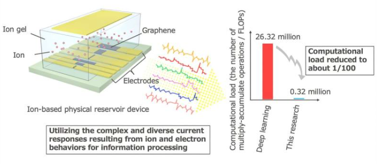 物理储层是一种受大脑信息处理方式启发的人工智能(AI)设备,以其低计算负载和低功耗特点受到重视,但其计算性能此前通常低于软件处理。该研究团队通过将具有高电子迁移率和双极性行为的石墨烯与离子凝胶相结合,构建了新型物理储层。器件中离子与电子以多种方式、不同速度进行复杂相互作用,使其能对输入信号产生时间常数范围极广的响应。