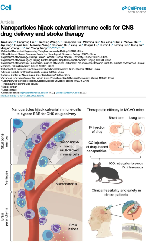 出版详情:标题:《Nanoparticles hijack calvarial immune cells for CNS drug delivery and stroke therapy》,发表于:《Cell期刊》。