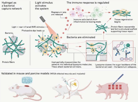该水凝胶的设计灵感来源于人体免疫细胞释放的网状蛋白结构,其主要成分为鸡蛋清中的溶菌酶蛋白纤维。在自然状态下,这些纤维构成一张物理网覆盖伤口;当受到近红外光照射时,凝胶内整合的热响应分子会使部分纤维暂时解离,释放出具有活性的溶菌酶分子,从而攻击并杀灭细菌。
