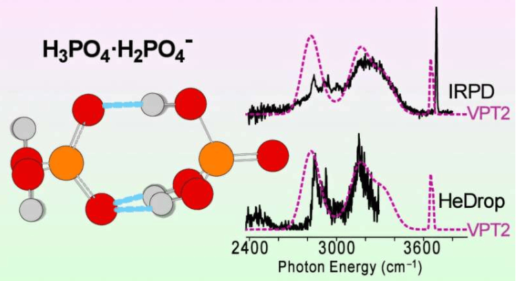 为探究这一过程的具体机理,研究团队重点关注了可能作为质子穿梭级联反应起点的关键物质——去质子化二聚体H₃PO₄·H₂PO₄⁻。他们在实验室中制备了这种分子,并采用低温光谱技术进行研究。研究人员将分子置于氦纳米液滴中,使其冷却至接近绝对零度(仅高于绝对零度0.37度),随后利用红外辐射解析其结构。这种极端冷却方法可有效排除干扰因素,实现高精度的分子结构解析。