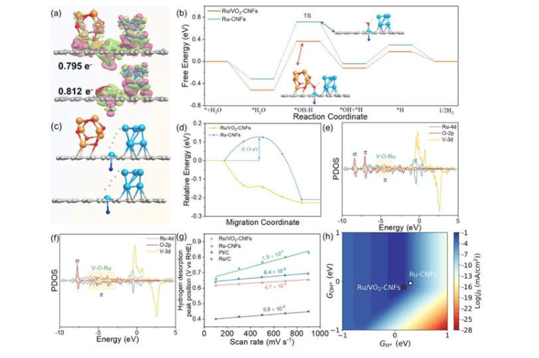 针对这一失衡问题,研究团队提出了一种“辅助驱动”策略,将钌(Ru)与二氧化钒(VO₂)相结合。通过在钌活性位点周围引入二氧化钒,催化剂被设计为能够连续优化水裂解步骤和氢气生成步骤。在钌与二氧化钒的界面处,形成的V-O-Ru共轭π键可动态调节活性位点的电子结构,促进水分子更快裂解。同时,可逆的氢溢流过程有助于调控氢的吸附状态,使催化剂更接近微观动力学模型预测的理想反应条件。