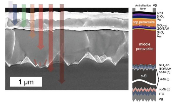 瑞士洛桑联邦理工学院工程学院的光伏与薄膜电子实验室(PV-Lab)与瑞士电子与微技术中心的科研人员近期在《自然》杂志发表论文,宣布开发出一种新型钙钛矿-硅三结太阳能电池,其独立认证效率达到30.02%,刷新了此前27.1%的认证记录。该器件由硅底电池、中间层和顶层钙钛矿薄膜构成,集成了高电压和高效率特性。