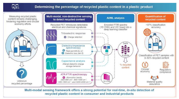 塑料回收涉及熔化、清洁和重塑,产品外观和化学成分与新塑料相似,但再生塑料存在微观杂质和断裂聚合物链等细微差异。研究团队采用四种传感技术检测再生塑料:摩擦电测试测量静电保持能力,介电/阻抗光谱评估能量储存和损失,电容分析跟踪充放电速度,中红外光谱揭示化学结构。
