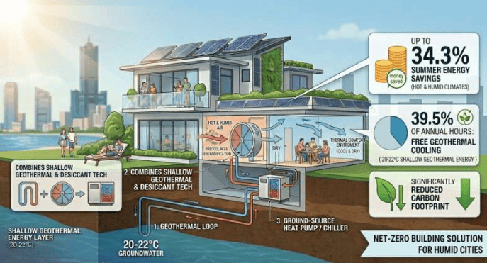 出版详情:作者:National Taiwan University;标题:《Hybrid desiccant and shallow geothermal cooling can cut energy use in humid climates》;发表于:《Energy Conversion and Management》(2026);期刊信息:《Energy Conversion and Management》。