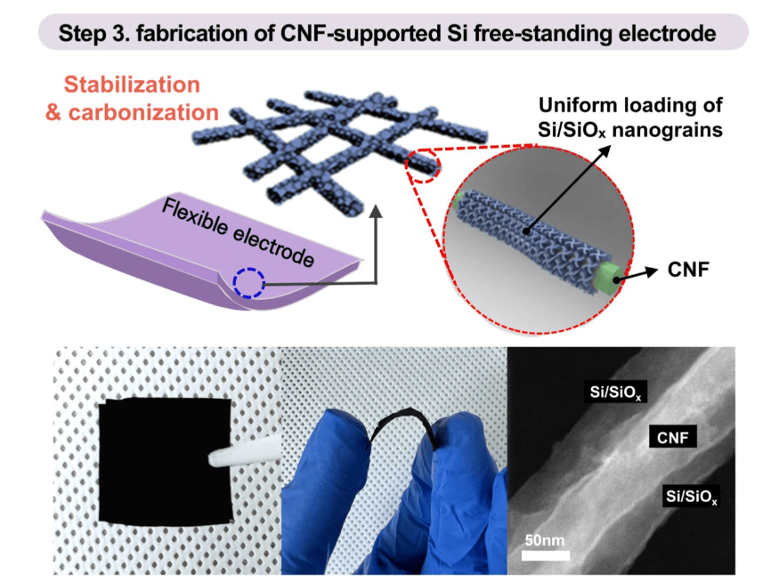 杨铉宇教授表示:“碳纳米纤维不仅被用作支撑物,而且还被用作独立式硅阳极的结构和导电骨架。”金善宰教授补充道:“硅负极长期以来一直受到反复循环过程中结构退化的限制。这项研究提出了一种克服这一问题的新途径。”