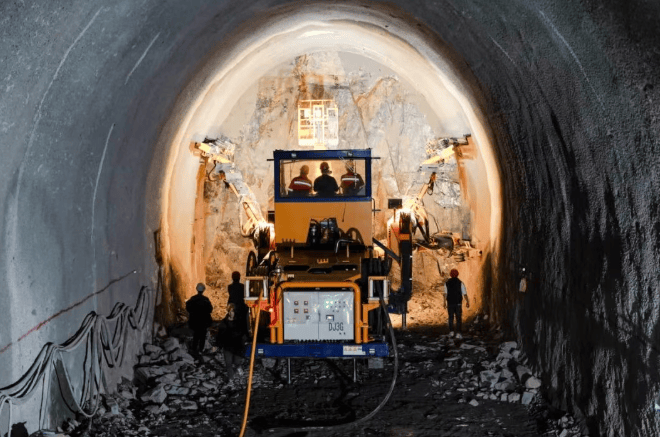 中国中铁工业旗下中铁装备自主研发的DJ3E智能型三臂凿岩台车持续推动隧道施工向机械化、智能化转型。该设备满足隧道钻爆破孔、锚杆孔、超前探孔、管棚孔、小导管等多种施作需求,实现了钻爆、支护、超前支护及超前钻探四大工序的机械化作业。