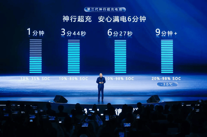 第三代神行超充电池聚焦"超充与寿命兼得"核心痛点,通过降产热、强散热、提精度三大手段,攻克温升导致寿命衰减的行业难题。该电池实现等效10C、峰值15C的全球最强超充能力,10%至35% SOC仅需1分钟,10%至80% SOC仅需3分44秒,10%至98% SOC仅需6分27秒;零下30℃极寒环境下,20%至98% SOC充电约9分钟,搭配电池自加热技术与超换一体补能网络,实现低温超充不挑桩。经测试,其完成1000次完整循环后,容量保持率仍超90%,兼顾极致性能与长期耐用性。此新电池一发布立即被业内拿来对比第二大动力电池商比亚迪,比亚迪的闪充实现了从10%到70%,5分钟就能充好;从10%到97%,9分钟就能充饱;零下30度,从20%到97%,控制在12分钟以内。这意味着在常温下,宁德时代的电池比比亚迪快了2分钟以上,而在零下30度的时候,约快3分钟。