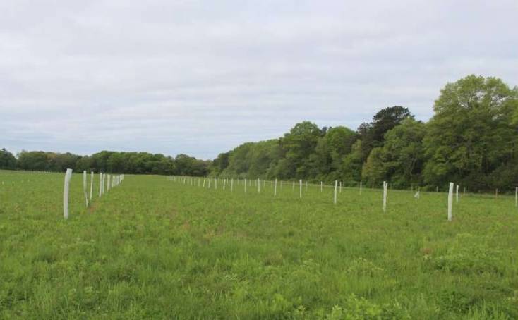 佩克汉姆农场曾作为草皮农场多年的田地,如今正经历着向林草复合系统的转变,地面上点缀着白色管道,其中培育着栗树、橡树、枫树和黑柳等本地树苗。 罗德岛大学劳拉·迈耶森教授在参观中介绍,此次改造旨在保护流域和恢复土...