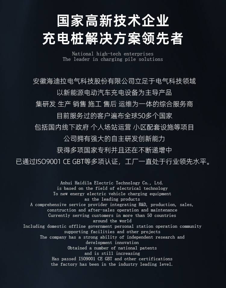 设备其他信息:噪音(dB)<65;稳流精度≤±1%;稳压精度≤±0.5%;输出电流误差≤±1%;输出电压误差≤±0.5%;均流不平衡≤±5%;人机显示:7寸彩色触摸屏;充电操作:刷卡或扫码;计量计费:直流电能表;运行指示:电源、充电、故障;通讯方式:标准通信协议/OCPP;散热控制:风冷;防护等级ip54; BMS辅助电源 12V/24V;可靠性(MTBF)50000;尺寸(W*D*H)mm :960*710*1880;安装方式:整体落地式;走线方式:下进线