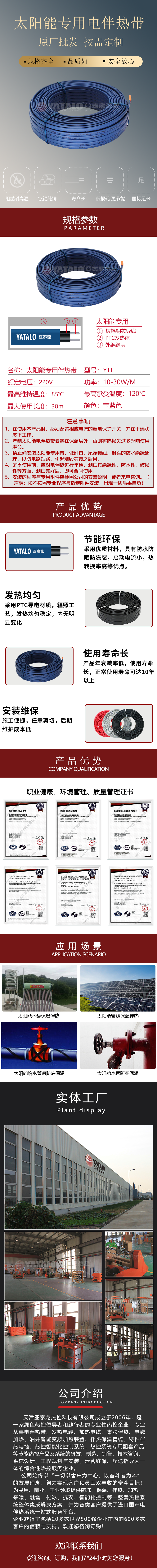 亚泰龙太阳能系列:公司研制生产的WXYTL系列太阳能专用电伴热带,广泛应用于商业和工业领域的太阳能进水管、太阳能出水管等诸多场合的伴热、防冻、维温、保温、抗凝。该电伴热带适用于普通区、危险区和腐蚀区。(不同应用场景与尺寸可通过本公司专业设计完成)