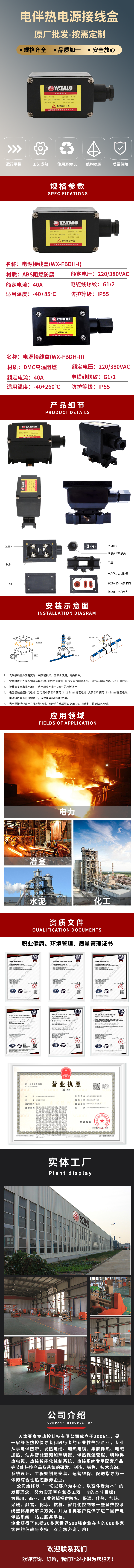 电源接线盒用于电源线与伴电热带的连接。一般固定在管道上,与伴电热带配套使用。既可单向输出,又可双向输出。