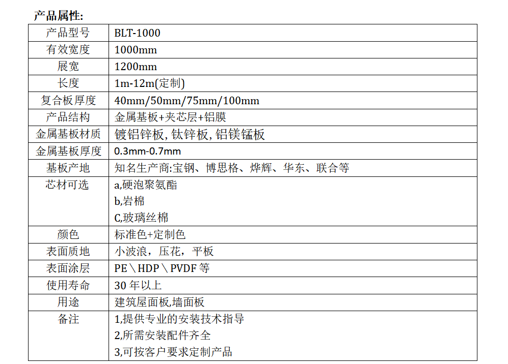 表层为氟碳漆面的金属板材,具有良好的耐候性与自洁性;中间层是聚氨酯硬质发泡或岩棉;底层是0.06mm厚铝膜或彩钢板,通过工厂自动化的设备将保温层和金属面板复合一体,满足建筑物保温隔热,隔声,防火、防腐等功能设计要求;该产品经过国内外广泛应用验证,已相当成熟。