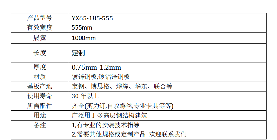 此楼承板波高65mm,波距185mm,有效宽度555mm设计,可承受较大荷载,闭口肋形于混泥土结合更牢固,形成高承载结构,具备较强抗震能力,闭口设计使钢板肋被混凝土完全包裹,防火性优于开口楼承板。