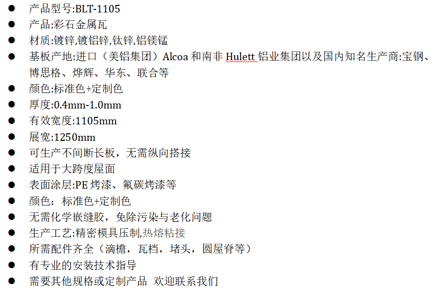 - 彩石均匀覆面使金属瓦免受紫外线照射,同时满足屋面瓦多变的色彩;