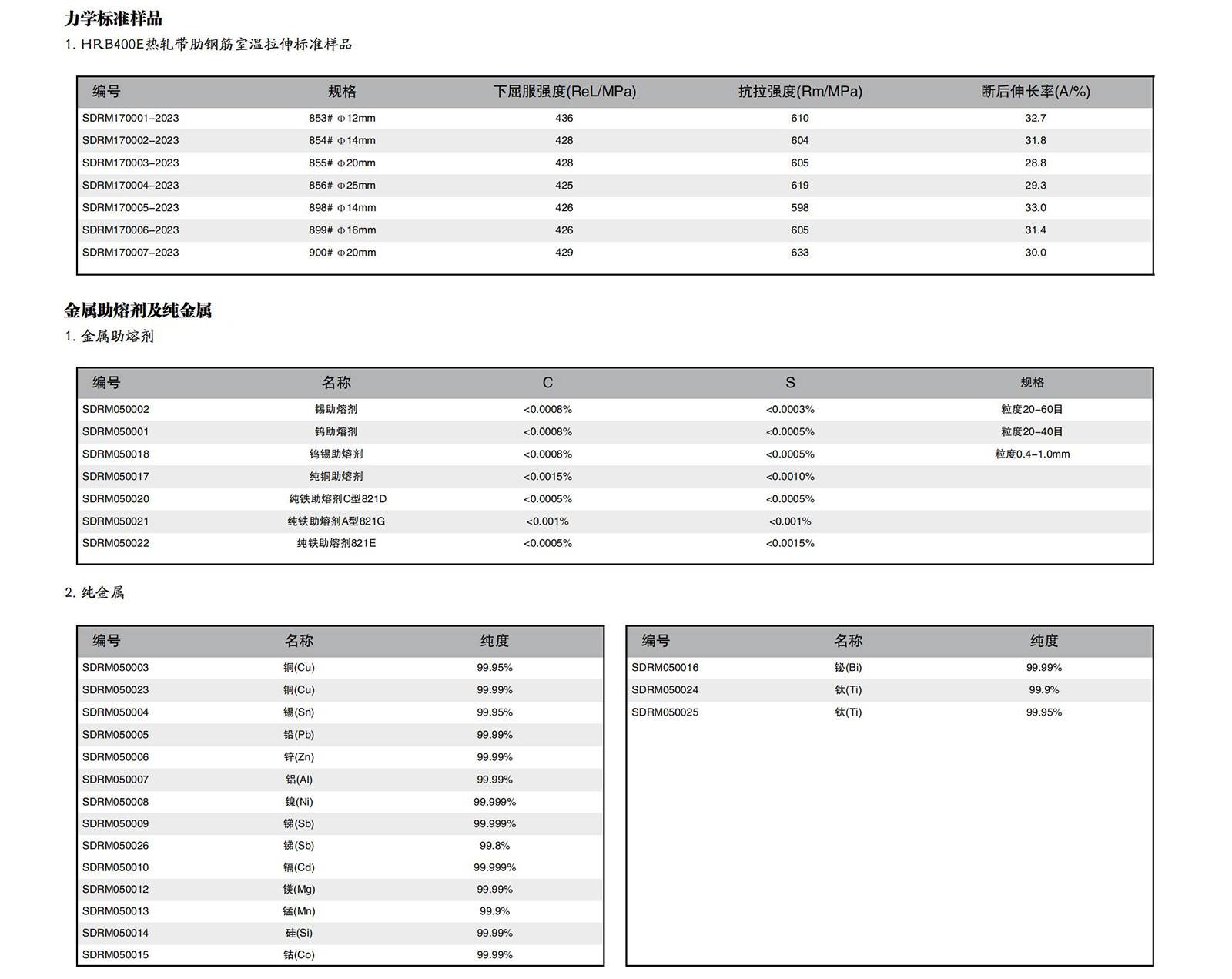 拉伸、纯金属、助熔剂 标准样品/标准物质