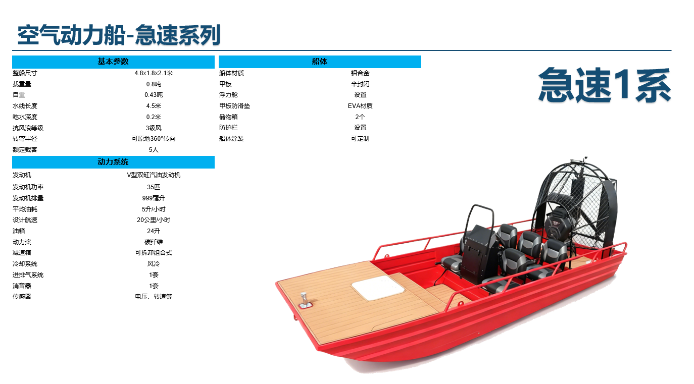 产品为平底、无断级、单甲板浮体结构,采用航空螺旋桨动力推进,其主体采用5052铝合金材料。