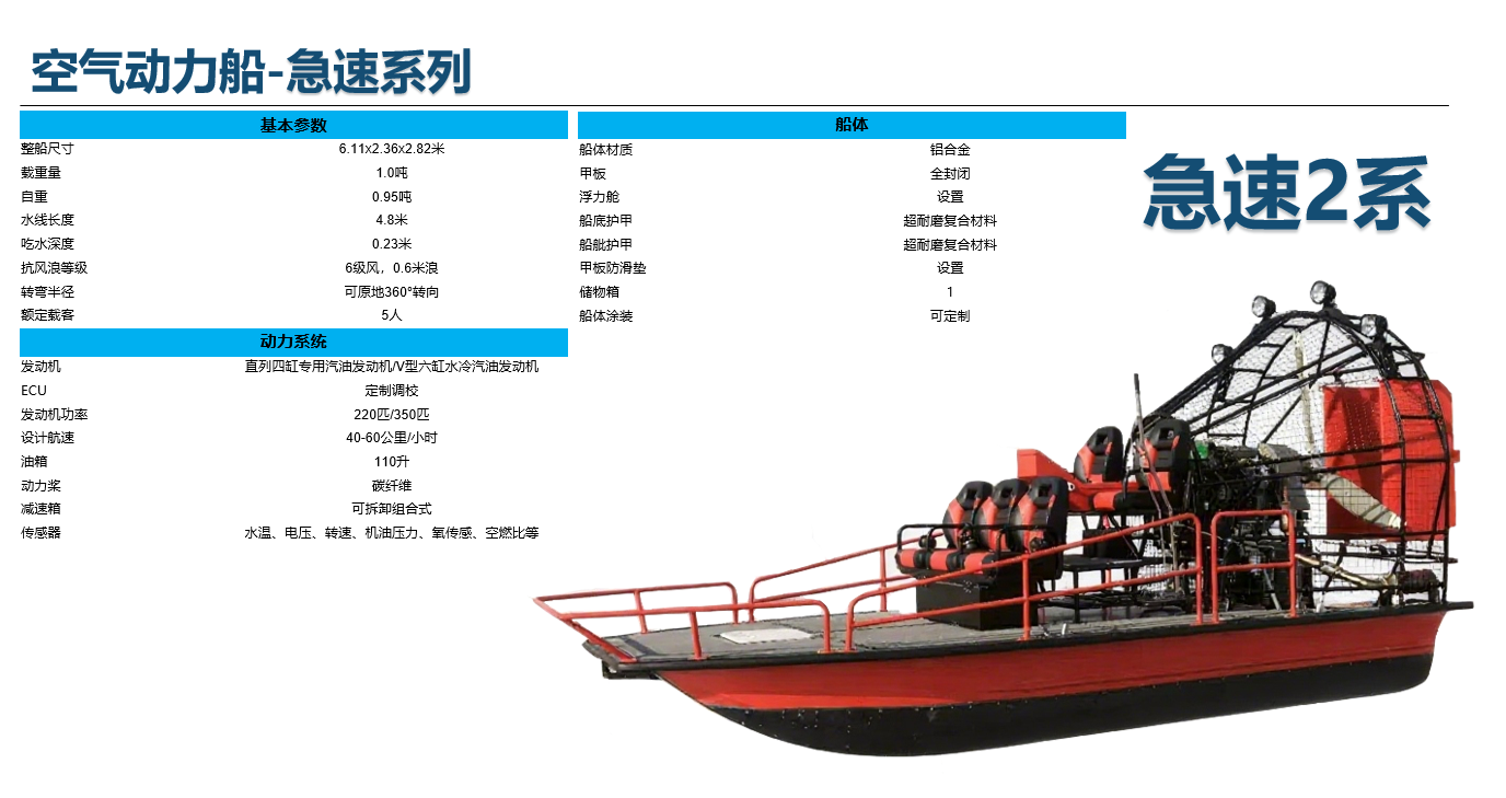 产品为平底、无断级、单甲板浮体结构,采用航空螺旋桨动力推进,其主体采用5052铝合金材料。