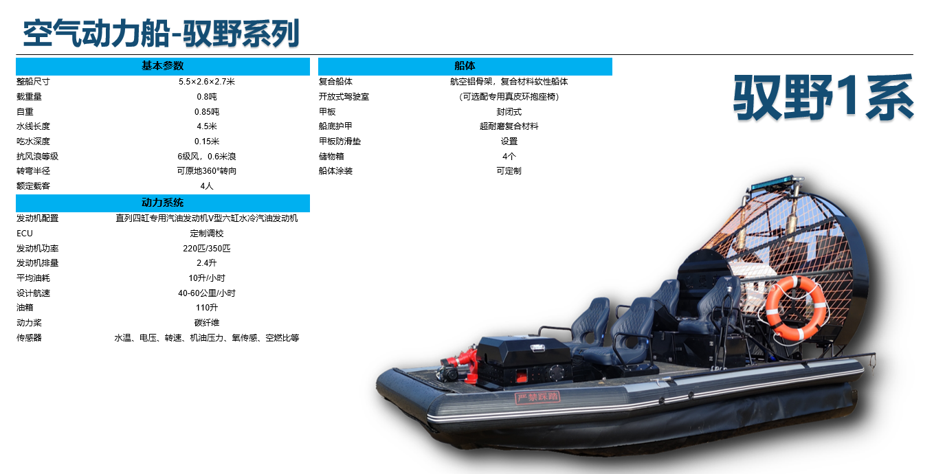 产品为平底、无断级、单甲板浮体结构,采用航空螺旋桨动力推进,其主体采用5052铝合金材料。