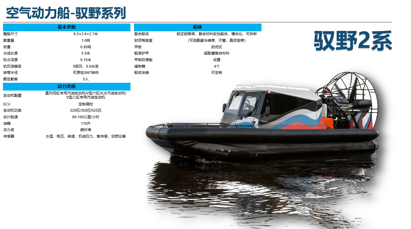 产品为平底、无断级、单甲板浮体结构,采用航空螺旋桨动力推进,其主体采用5052铝合金材料。