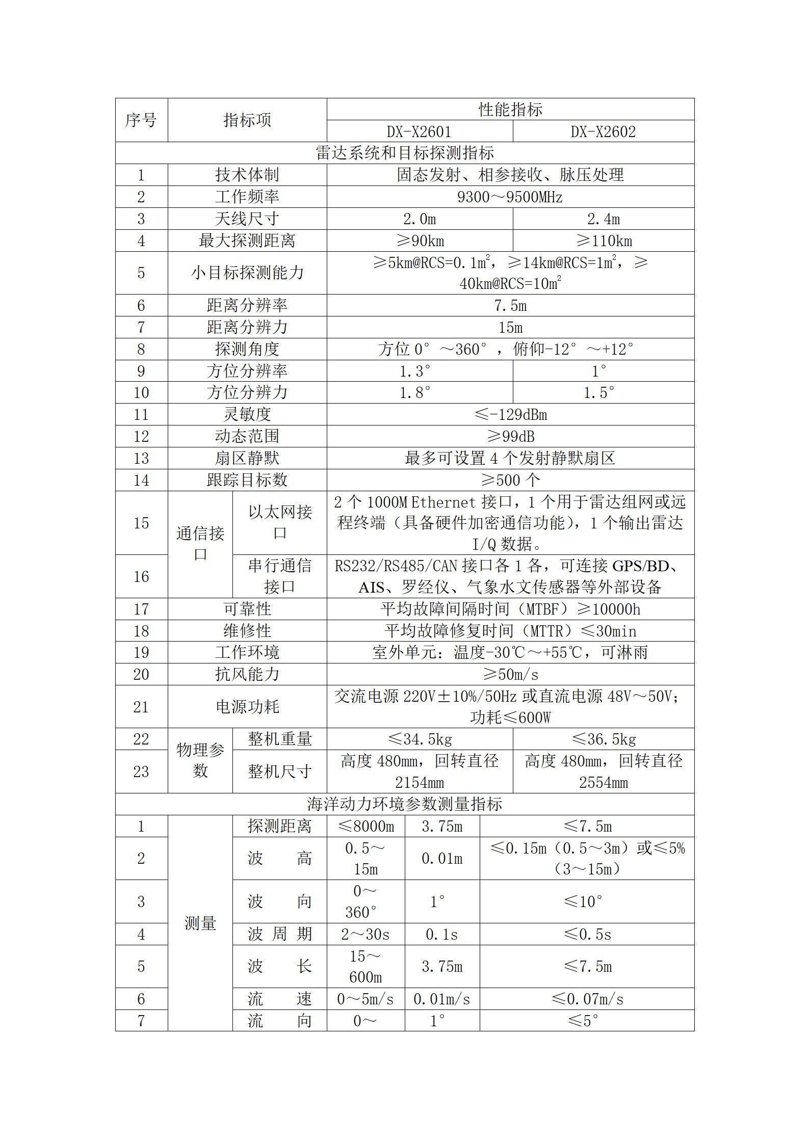 DX-X20601/2602雷达是一种采用固态发射、相参接收、脉冲压缩处理等技术的水面及低空目标探测和海气边界海洋动力环境测量设备。