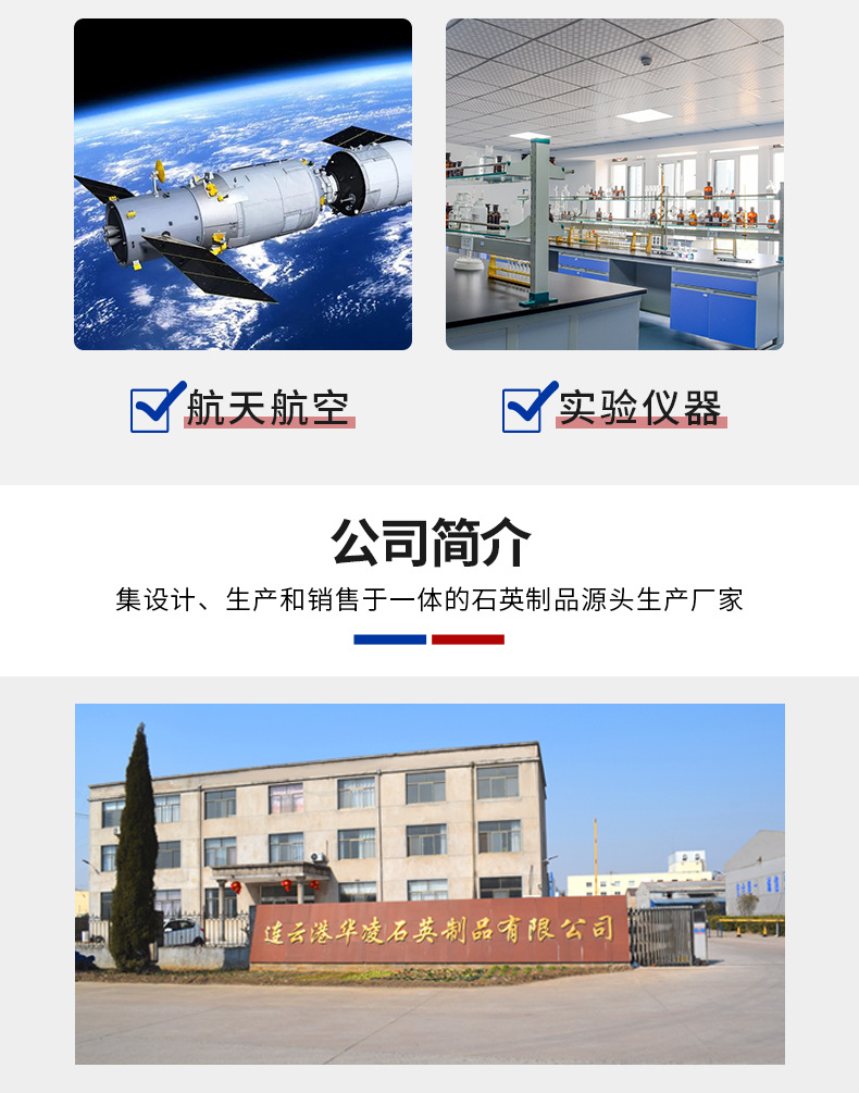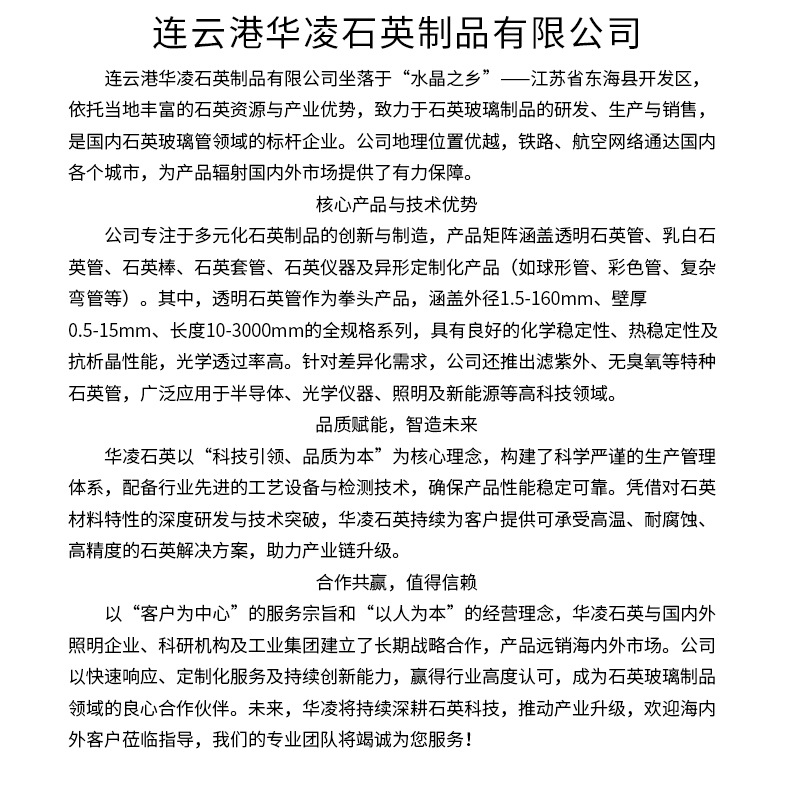 连云港华凌石英制品有限公司成立于2009年,主要生产各种规格的石英玻璃棒及各种规格的石英玻璃管,主打产品石英玻璃棒以及石英厚壁管。特别是本公司生产的石英玻璃棒目前在国内外获得用户的高度评价。本公司拥有完整、科学的质量管理体系。连云港华凌石英制品有限公司的诚信、实力和产品质量获得业界的认可。欢迎各界朋友莅临参观、指导和业务洽谈。我公司宗旨:质量保证,信誉至上,价格合理。欢迎新老客户垂询,以求共同发展。公司总经理携全体员工热诚欢迎国内外新老朋友惠顾,共谋发展。