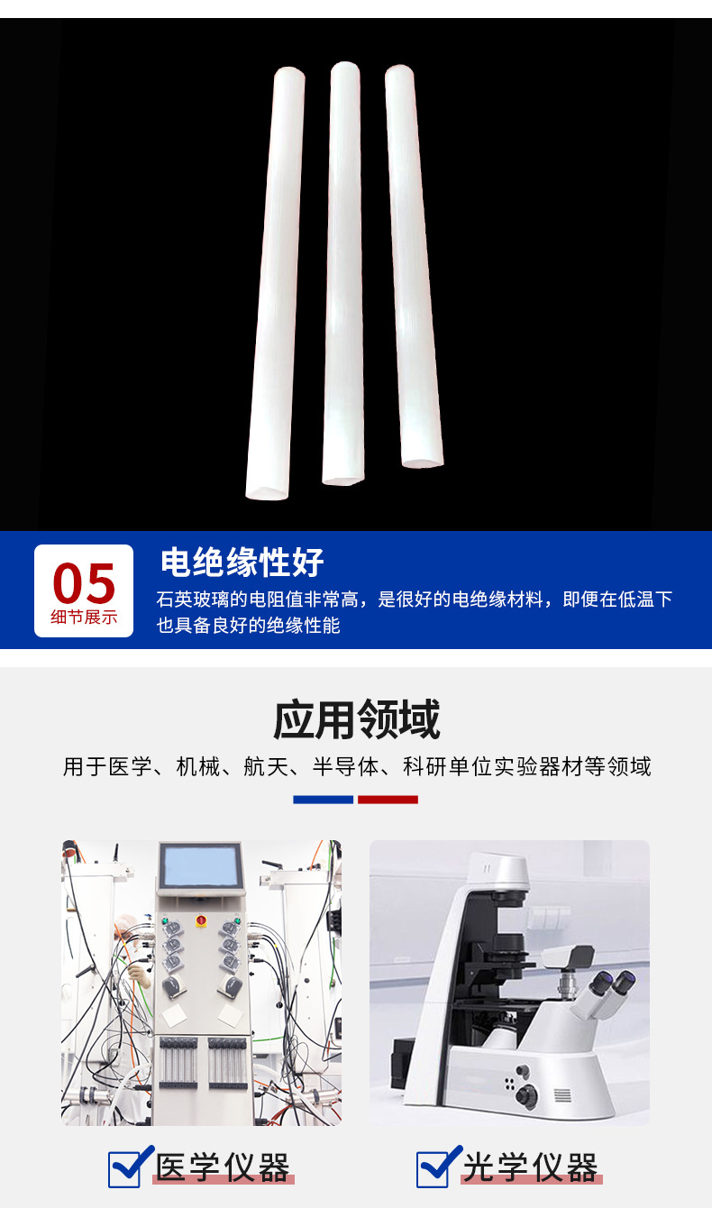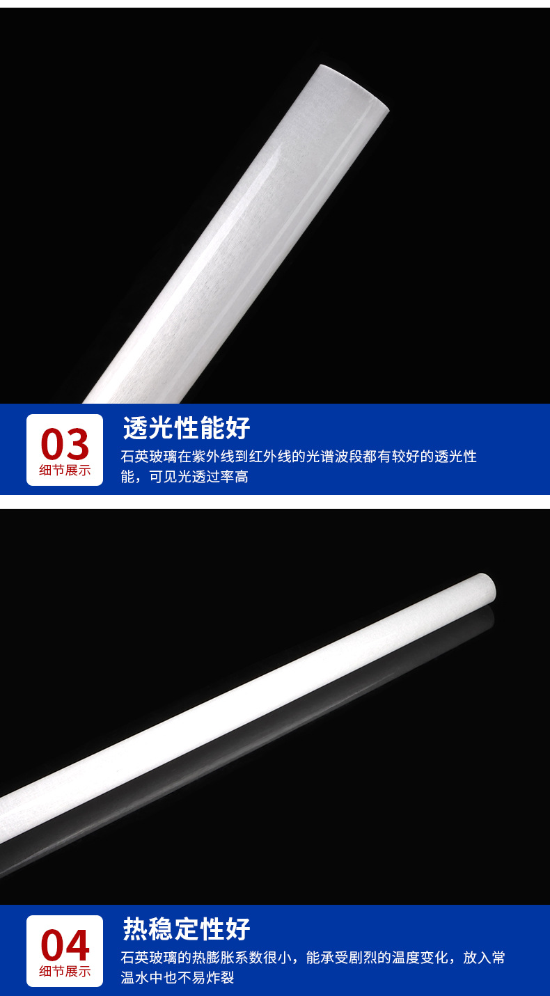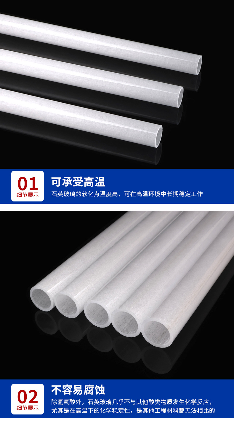 公司专注于多元化石英制品的创新与制造,产品矩阵涵盖透明石英管、乳白石英管、石英棒、石英套管、石英仪器及异形定制化产品(如球形管、彩色管、复杂弯管等)。其中,透明石英管作为拳头产品,涵盖外径1.5-160mm、壁厚0.5-15mm、长度10-3000mm的全规格系列,具有良好的化学稳定性、热稳定性及抗析晶性能,光学透过率高。针对差异化需求,公司还推出滤紫外、无臭氧等特种石英管,广泛应用于半导体、光学仪器、照明及新能源等高科技领域。品质赋能,智造未来