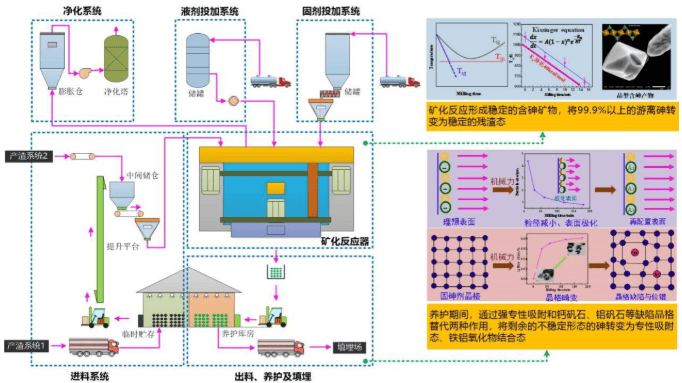 有色行业年排放砷量约占全国砷排放总量的一半,且排放的砷90%以上以固废形态储存,简单堆存会造成二次污染,影响周边人民群众的身体健康。公司研发的“含砷危废矿化解毒系列技术” ,通过专有矿化剂和废渣中的砷反应使其转变为具有类含砷矿物稳定性的形态,从而使处理后砷渣中砷的浸出毒性能稳定低于1.2mg/L。主要原理及路线图如下: