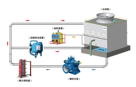 循环水场主要由冷却塔、循环水池、循环水泵、旁滤系统、加药系统、管道、阀门、仪表及控制系统等组成。