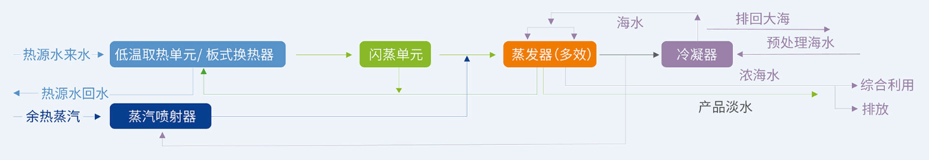 系统由闪蒸装置或蒸汽喷射器、多效蒸发器和冷凝器组成,采用低温模式,以闪蒸蒸汽或余热蒸汽作为热源,加热首效蒸发器的海水,热源冷凝成淡水。同时产生的二次蒸汽作为下一效蒸发器热源,依次进行。各效蒸发器和冷凝器的冷凝水汇集后作为产品淡水,浓海水可再进行综合利用或直接排放。