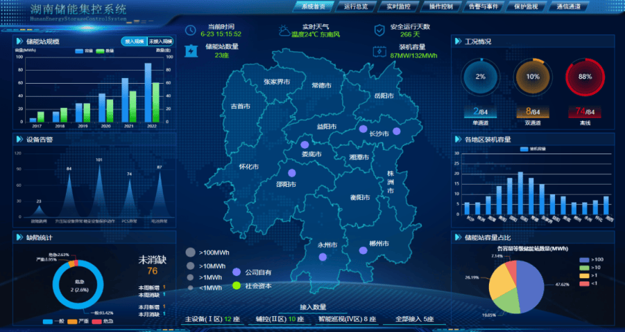 湖南综合能源公司储能站集中监控系统:国内首座省级综合能源储能集控中心。储能集控中心建设在东塘电力办公楼裙二楼,接入集中式储能站7座(装机120MW/240MWH),根据《国网湖南综合能源服务有限公司源网荷储一体化集控中心建设工作方案》建设,接入储能站运维数据和电芯数据,具备数据挖掘与分析等高级应用,实现了储能产业集中式一体化平台运维管控