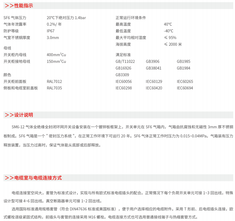 断路器采用负荷开关替代隔离开关,更安全可靠,一次侧全密闭设计提供意外接触的保护满足五防要求的机械联锁带电显示器可提供进出线路带电指示运行可靠:全密闭设计,所有10kV开关及母线带电体均密封在3mm不锈钢板焊接成的气箱中;配硅橡胶电缆插头,实现电缆头全绝缘全密封,从而不受灰尘、潮湿、小动物等外界环境影响弹簧储能操作机构,可人工或电动操作面板模拟线图提供开关位置指示柜体用镀锌板制作,表面静电喷涂,增强抗腐蚀性能压力表监视箱体内SF6气体安全压力范围。经济性: