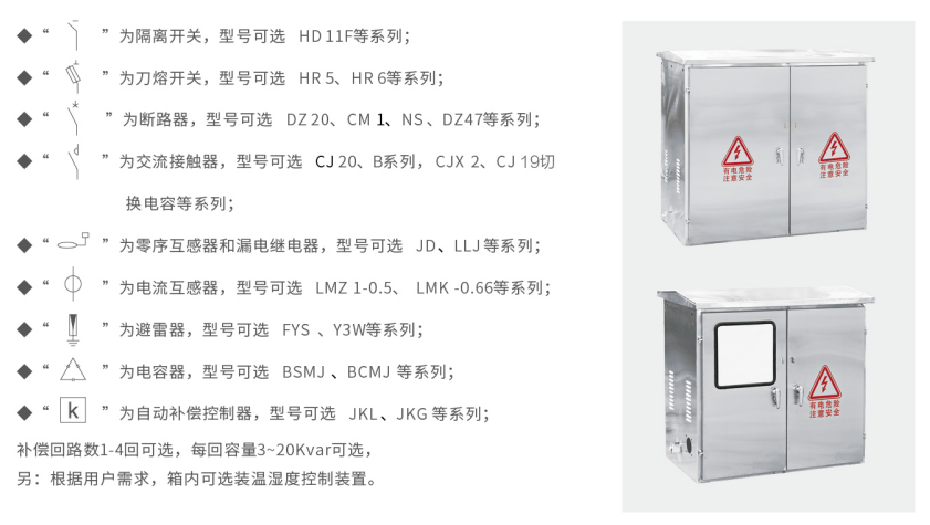 JP系列户外综合配电箱,是集计量、出线、无功补偿等多功能于一体达到户外综合配电装置,具有短路、过载、过电压、漏电保护等功能,体积小、外型美观、经济实用,安装于户外柱上变压器的电杆上,是城乡电网改造的新型理想配电产品。