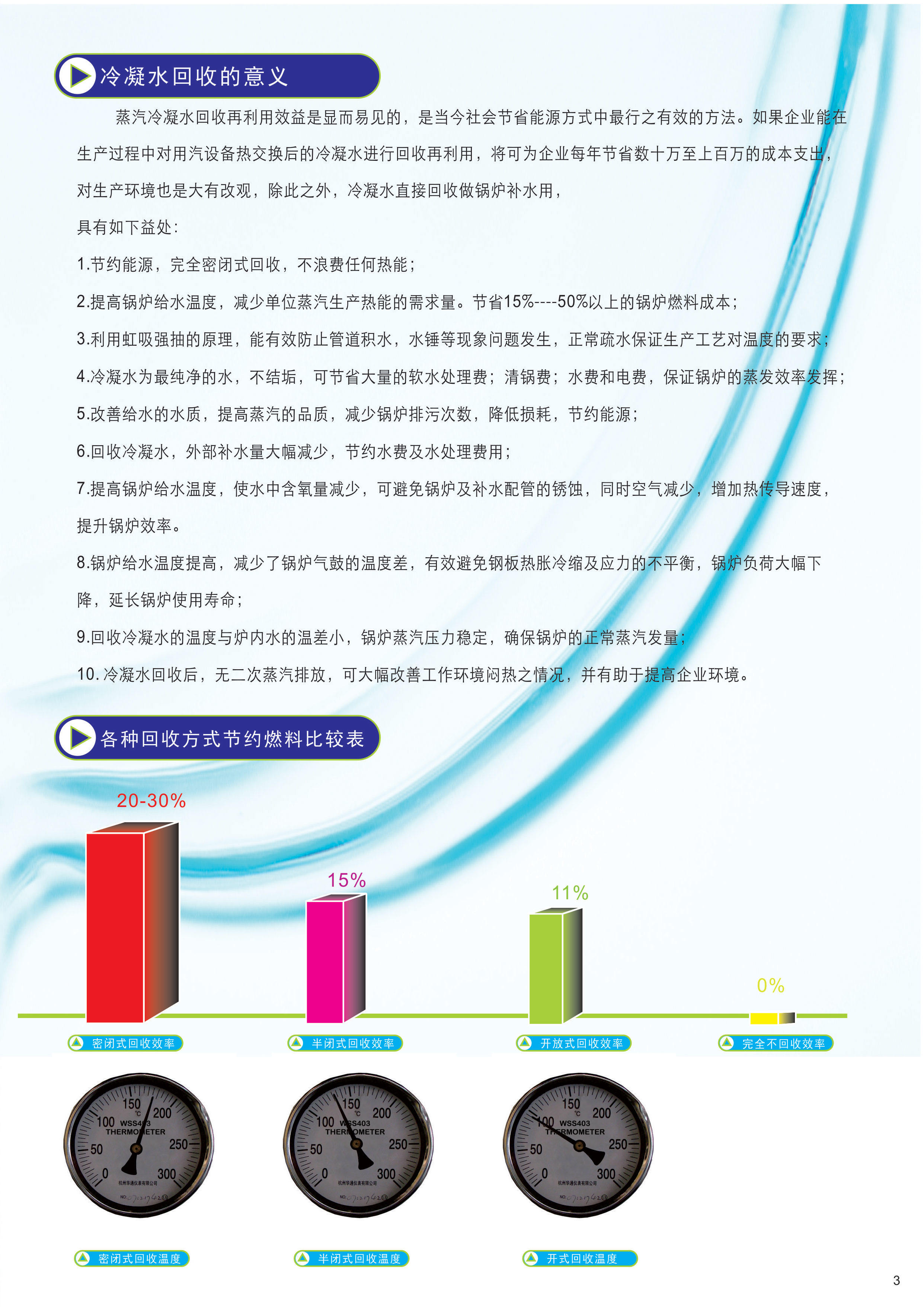 完全密闭式高温冷凝水回收,可回收180℃以下的高温冷凝水。系统采用PLC自动控制,无人值守,运行安全可靠,节能效率可达20%以上。适合回收啤酒、烟草、造纸、纺织、印染、化纤、木材、化工、橡胶、汽车、建材、宾馆采暖等行业的蒸汽冷凝水。 为您节省15%---50% 以上的锅炉燃料 1可做到真正的密闭式回收效益,不浪费任何热能,达到的节能效果。 2产品设计完善,性能稳定,效率高。 3密闭式回收,能有效弥补疏水阀选型不当而造成用汽设备蒸汽泄漏。 4利用虹吸强抽原理,能有效防止管道积水;水锤等现象问题的发生,正常疏水保证生产工艺对温度的要求,不会影响企业正常化生产。