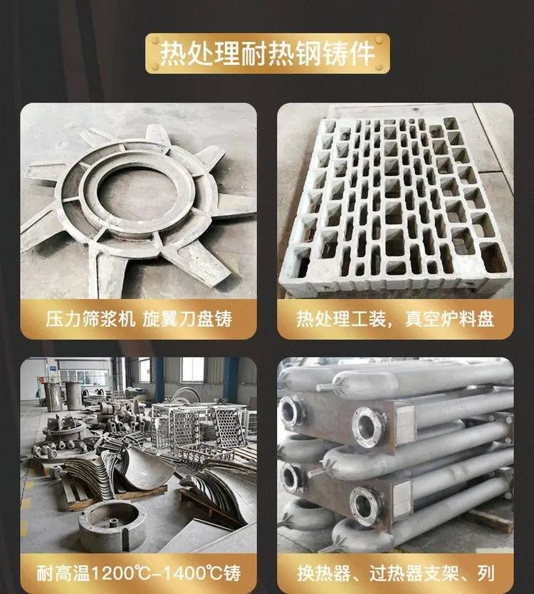 公司常年接单定制热处理用炉枕、炉板、炉管、炉排、料框、料枕、料盘、托盘;电厂用流渣管、煤粉管、下料管、耐磨管道、耐磨衬板、双金属管道等;钢厂用炉辊、滑块、溜钢槽、垫块、舟皿、匣钵、风帽、炉门、炉门框;矿山水泥机械用锰钢齿板、合金锤头、耐护板、锤臂、顺灰管、窑口护板等耐热钢、不锈钢、合金钢、灰铁、球铁类铸件、铸管、离心铸管、圆钢、线材、丝材、钢锭、钢管、板材、锻件、法兰、紧固件等产品。