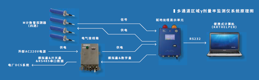 多通道区域γ剂量率监测仪可外接4路H2GRM06型或H2GRM07型γ剂量率探测装置,主要适用于连续测量核电站Ⅲ型区域和周围环境的γ辐射剂量率。当γ剂量超阈值时提供超阈值报警,以保证工作人员辐射安全。主要由GM计数管探测装置、H5LPDU01型就地处理显示单元以及H2EJB11型电气接线盒等部件组成。