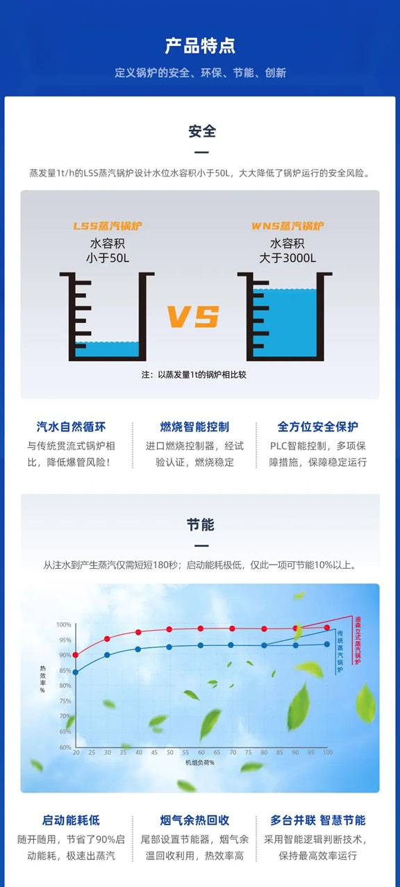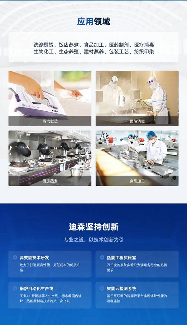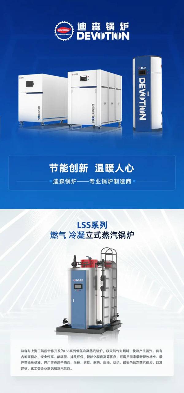 迪森锅炉与上海工锅所合作开发的LSS系列低氮冷凝蒸汽锅炉,以天然气为燃料,快速产生蒸汽,具有占地面积小、安全性高、能耗低、排放环保、智能化程度高等优点,可满足国家最新能效标准、最严苛排放标准,已广泛应用于酒店、学校、医院、制药、洗涤、纺织、印染的洁净蒸汽供应,以及建材、化工等企业高饱和蒸汽供应。