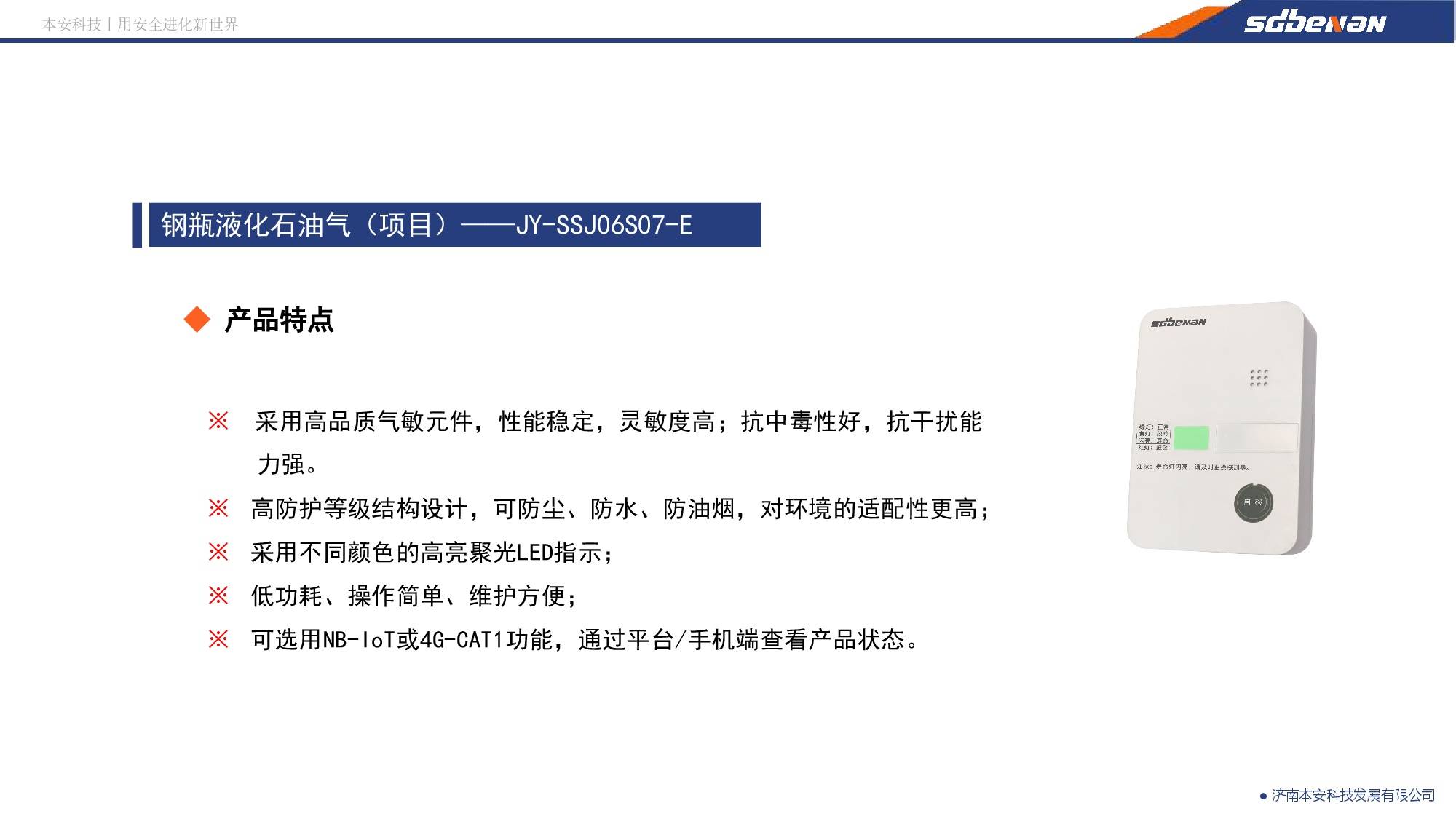 JY-SSJ06S07-E 家用型液化气探测器按照GB15322.2-2019设计,实时探测环境中液化气浓度。当液化气浓度超过报警设定值时,发出声光报警信号,并联动电磁阀切断气源,适用于家庭室内钢瓶液化气的泄漏监测。