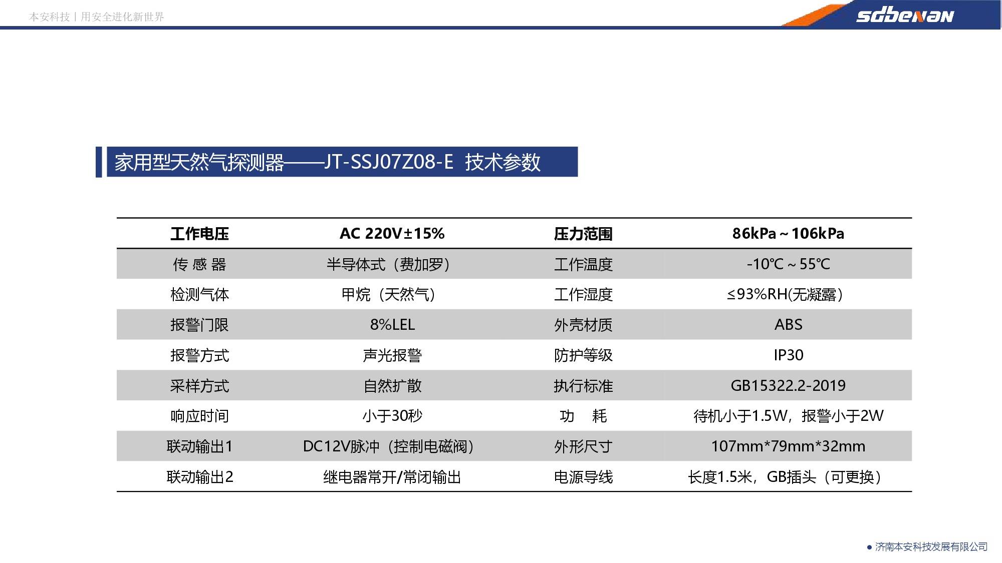 JT-SSJ07Z08-E 型 家用型天然气探测器按照GB15322.2-2019设计,实时探测环境中天然气浓度。当天然气浓度超过报警设定值时,发出声光报警信号,并联动电磁阀切断气源,适用于家庭室内天然气管道的泄漏监测。