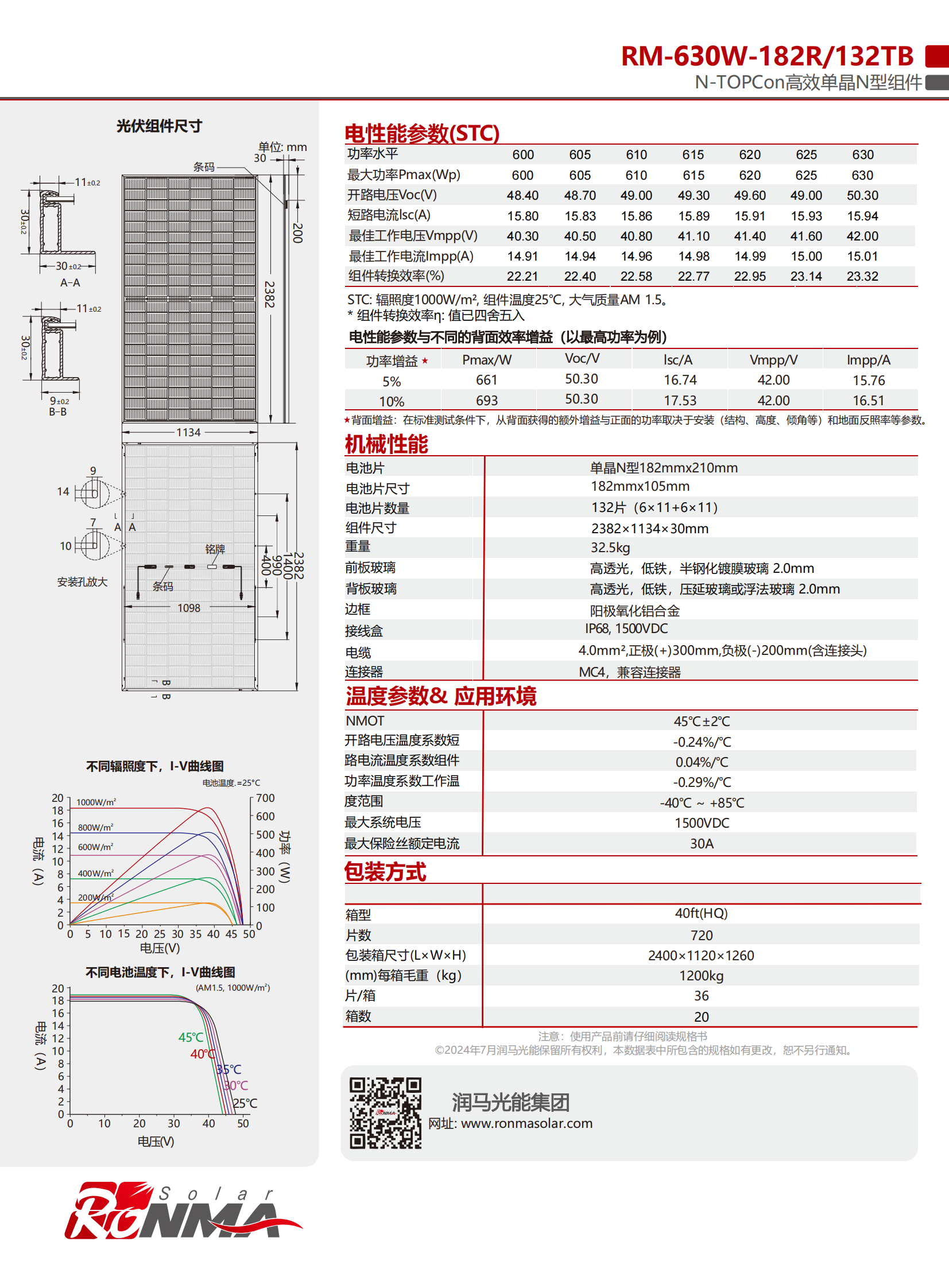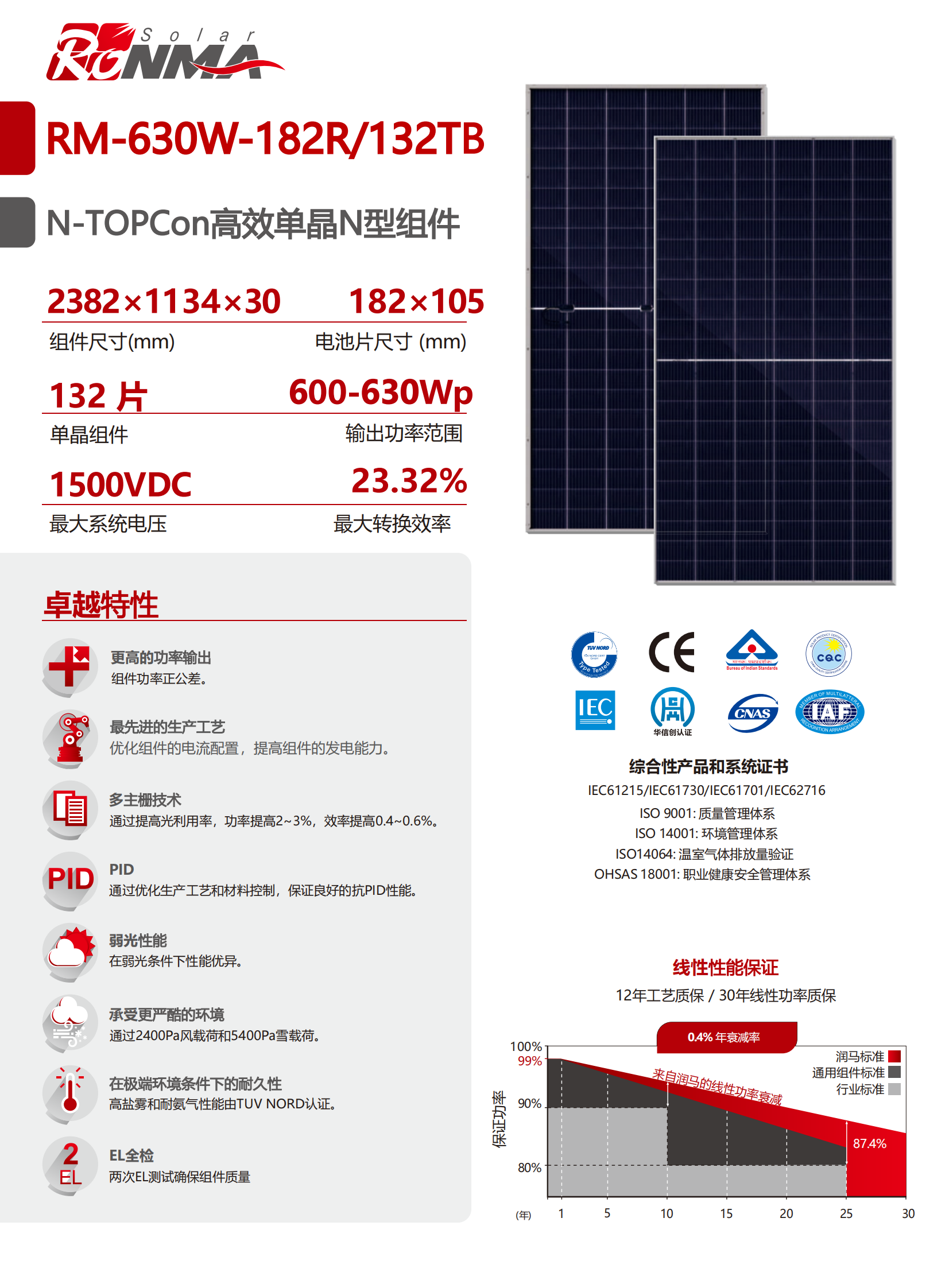润马光能单晶硅双玻光伏组件(Ronma Solar)RM-600W~630W-182R/132TB