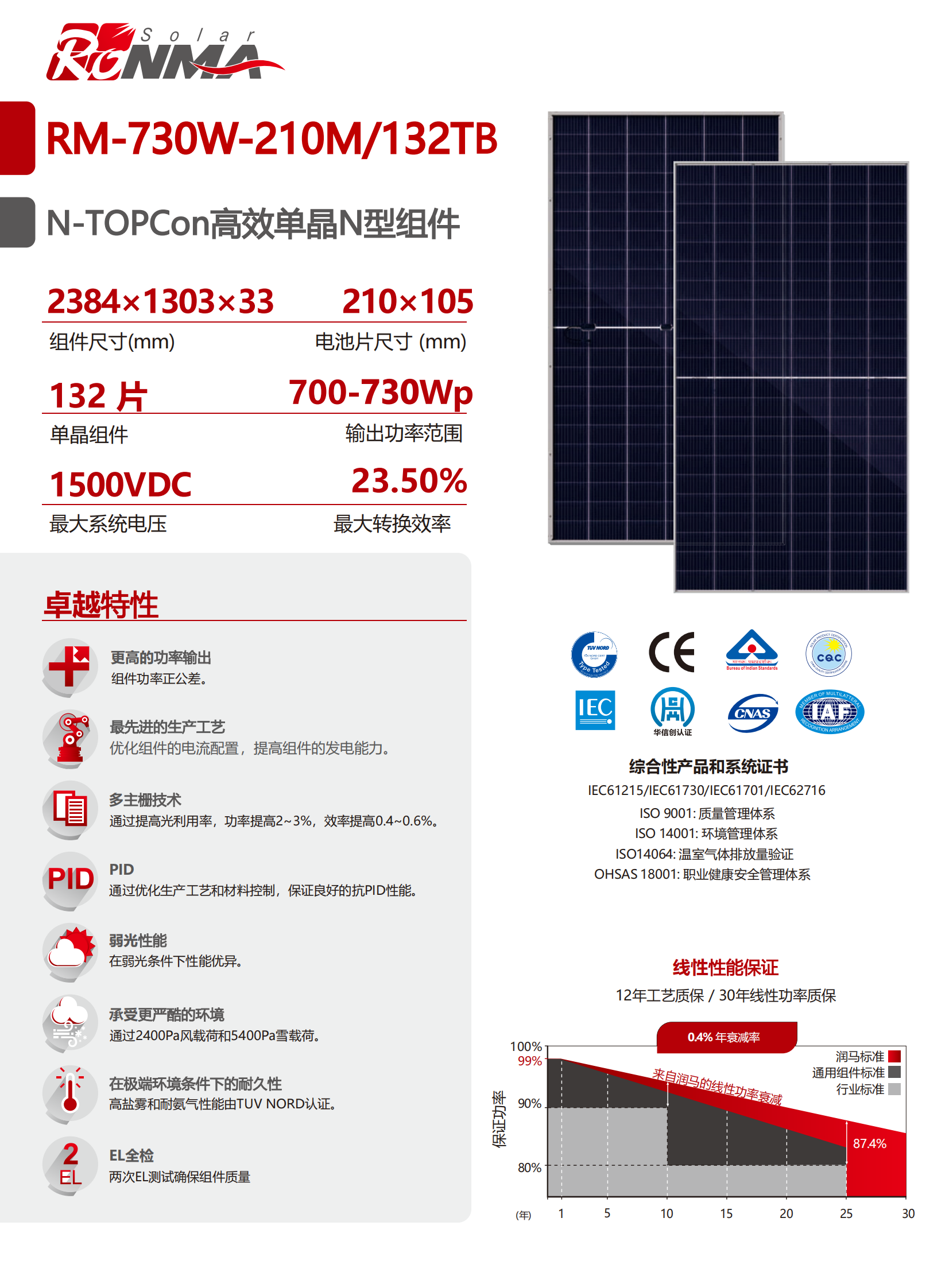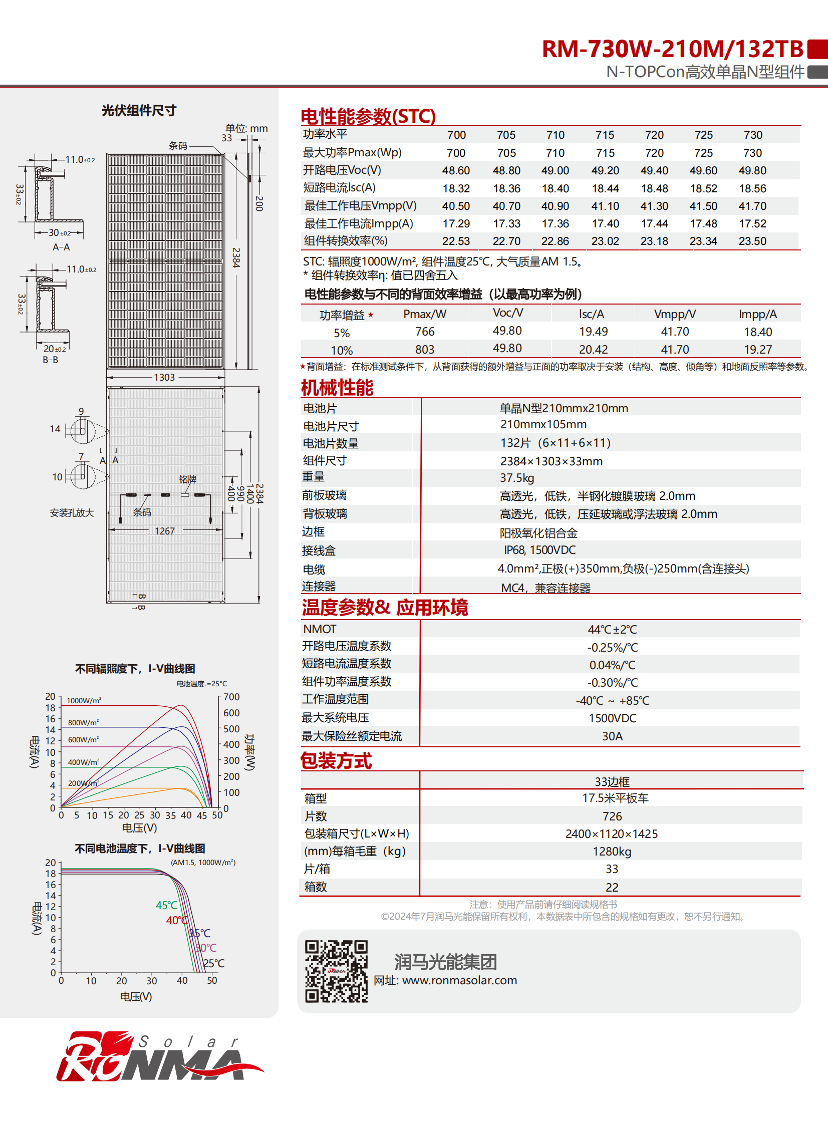 润马光能单晶硅双玻光伏组件(Ronma Solar)RM-700W~730W-210M/132TB