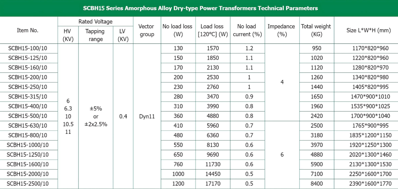 SCBH15-100至 2500KVA-10KV 系列非晶合金干式电力变压器是一款高效、环保、节能的变压器,专为配电应用而设计。该系列采用先进的非晶合金铁芯技术,与传统变压器相比,可显著降低能量损耗,是工业和商业用途的理想选择。这些变压器的容量范围从 100 KVA 到 2500 KVA,额定电压为 10 kV,经过精心设计,具有最佳性能、耐用性和可靠性。