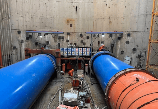 为保障施工连续性,隧道股份项目团队在节前完成设备检修、材料储备及后勤保障全流程部署。顶管机、泥浆处理系统等关键设备运行稳定,管材及备品备件储备量满足30天连续作业需求。春节期间,200余名隧道股份建设者轮班值守,通过“人休机不停”模式推进1号井至取水头部陆域顶管及水域双线顶进,实现日均掘进15米的高效作业。
