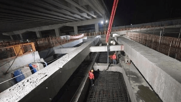 G1503公路隧道段全长约3.2公里,采用明挖顺作法施工。最后一块顶板位于闻居路跨线桥下方,作为跨线桥托换的核心环节,项目团队通过低净空、大直径超深钻孔灌注桩技术构建托换桩基,在基坑开挖期间精准凿除老桥桩基,将跨线桥沉降控制在1厘米以内,高质量完成托换任务,确保公路隧道结构顺利贯通。