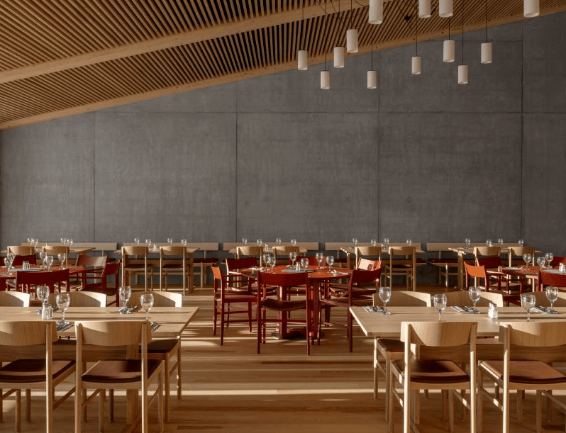 新学校建设以暴露的松木和云杉结构为主,搭配混凝土框架与全高玻璃幕墙,形成明亮开放的内部空间。设计团队通过空间序列、材料质感与光线的运用,营造出与自然环境深度融合的氛围。建筑部分嵌入斜坡,坐落在一个混凝土基座上,横跨两层:下层为会议、办公及技术区域,上层餐饮区则享有开阔视野。北部入口处,建筑以“角度偏移”设计形成三角形空间,容纳酒吧、自助餐区及混凝土楼梯间,中央天窗带将自然光引入建筑中心。